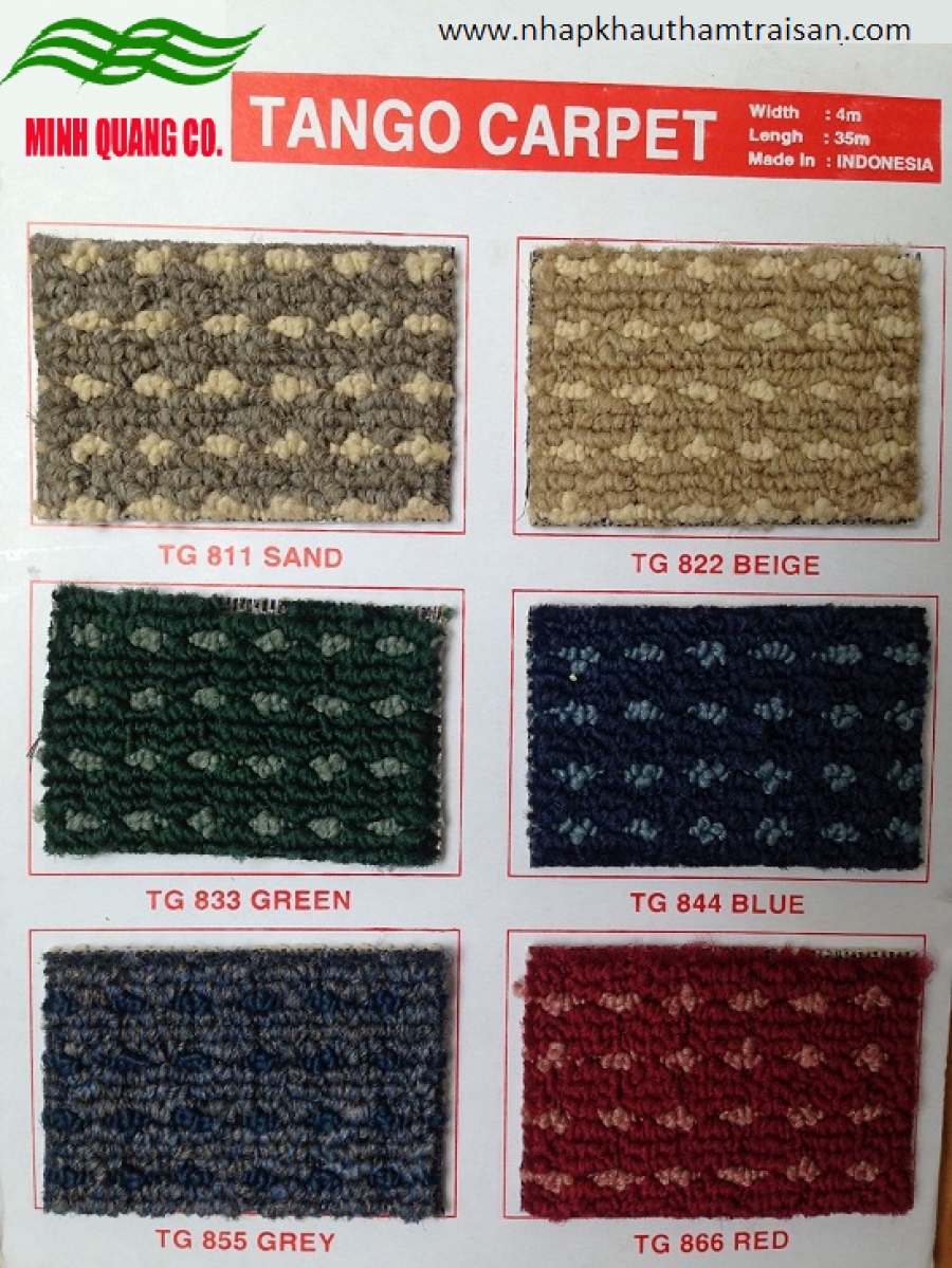 | * Thảm lót sàn văn phòng TANGO Carpet: * Kiểu dệt Loop Pile * Chất liệu Olefin BCF * Khổ 4m x 35m * Độ dày của sợi ≈ 5mm * Nguồn gốc: Indonesia |