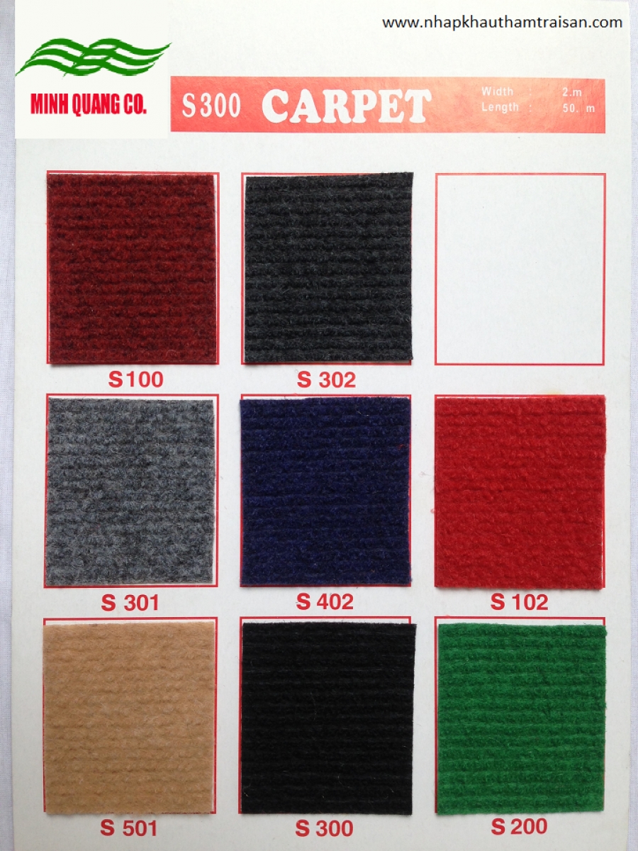 | * Thảm lót sàn văn phòng, hội nghị, tổ chức sự kiện S300 Carpet: * Khổ 2m x 50m * Độ dày của thảm: 2mm * Nguồn gốc: Indonesia |